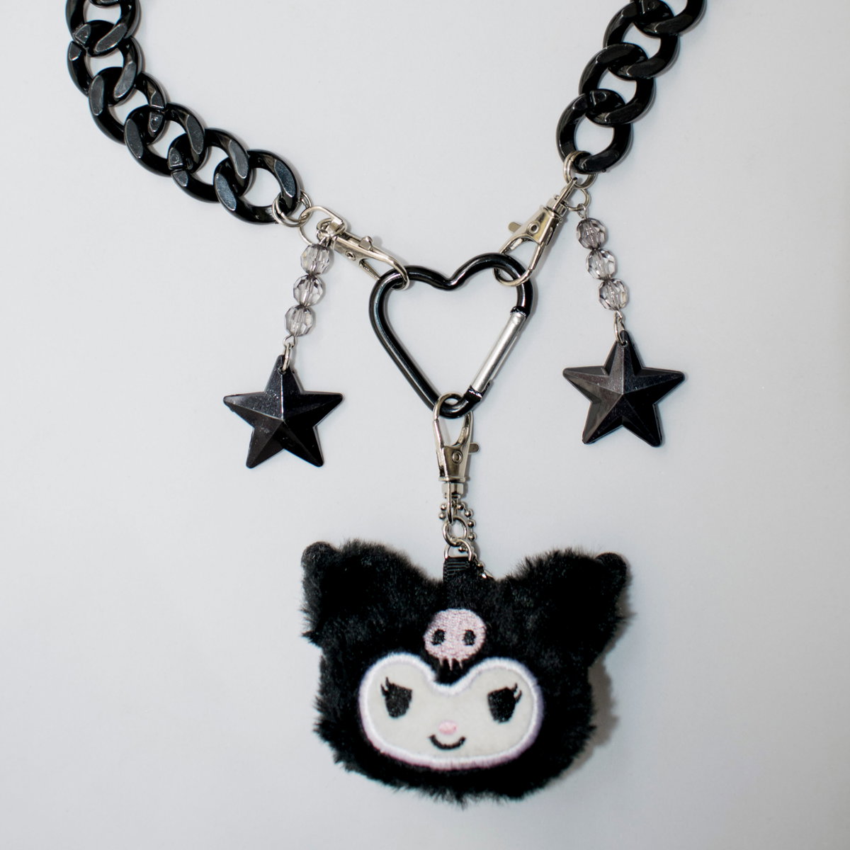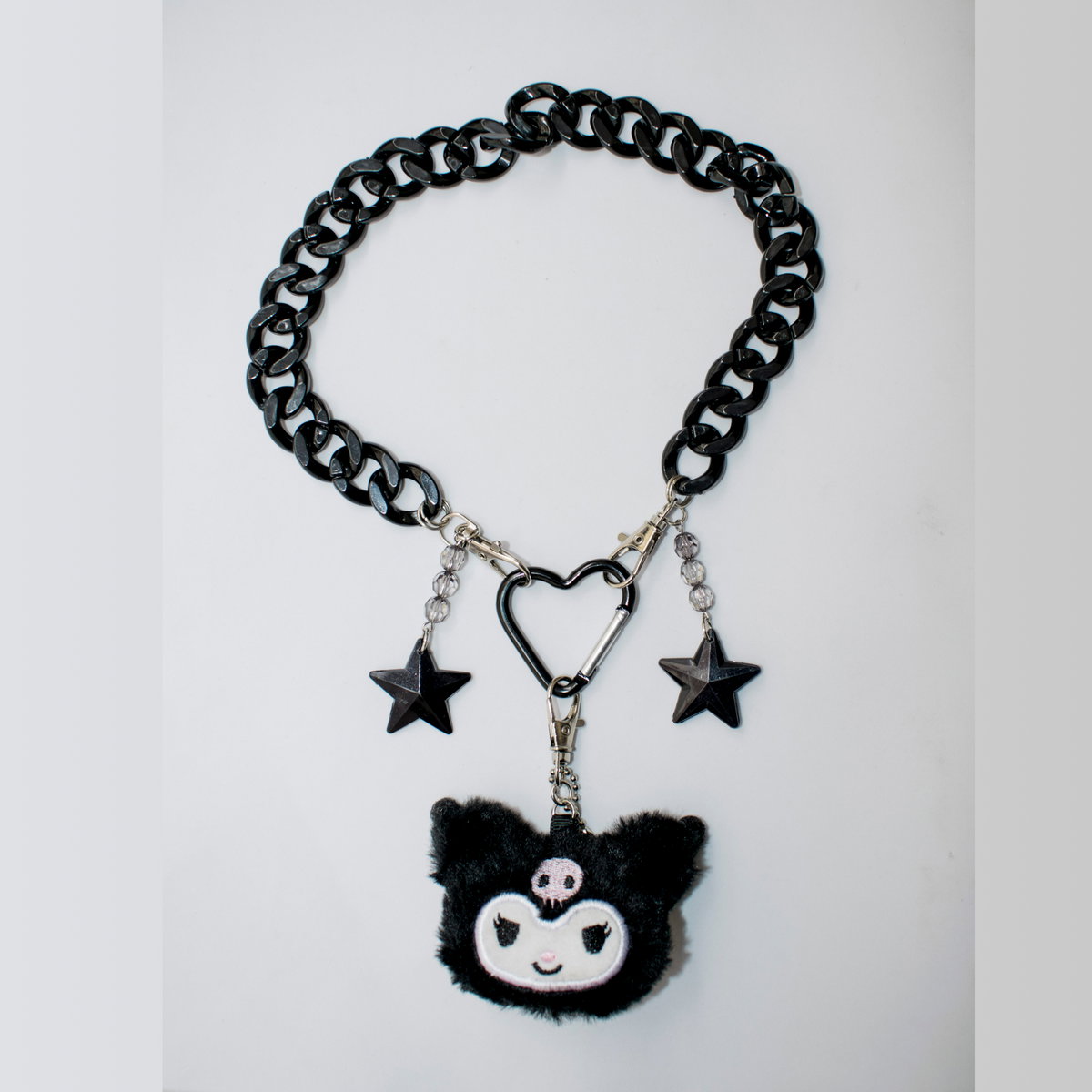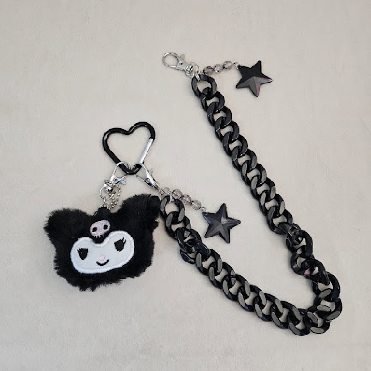 Incluye un gancho carabinero negro, un peluche de kuromi que se puede usar por separado y una cadena de eslabones negra que se puede usar tanto como collar, cadena en el pantalón o colgante como charm ⋆⁺