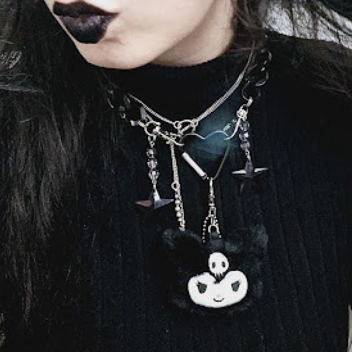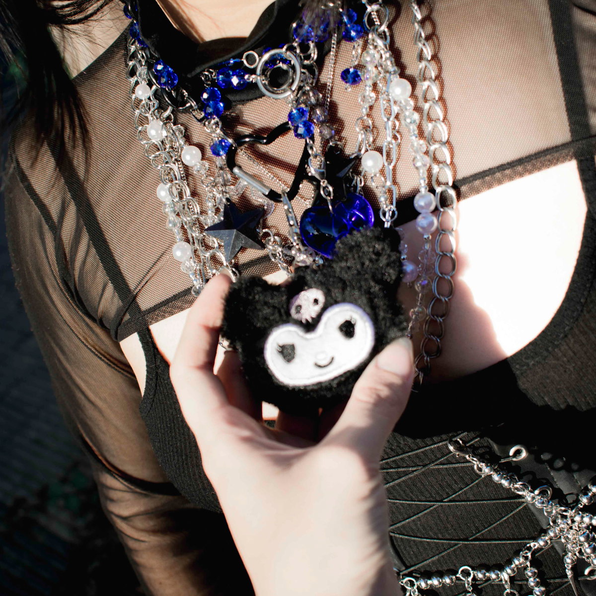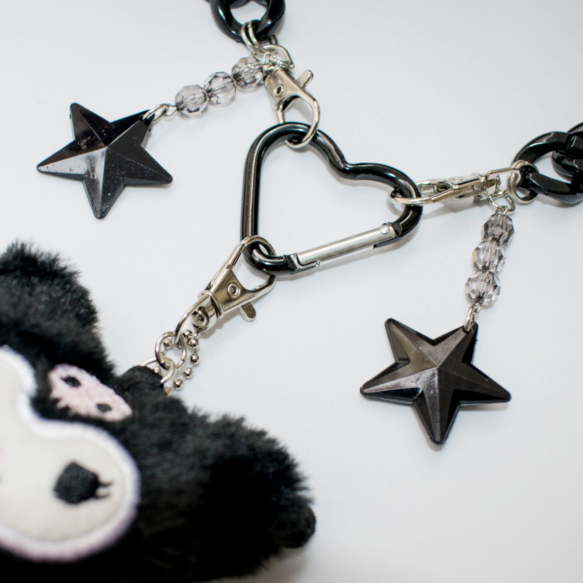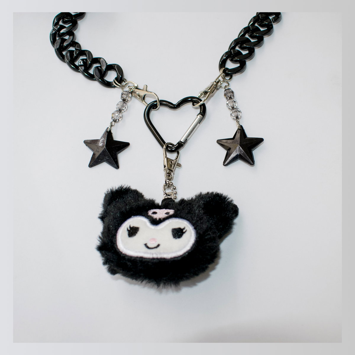 Incluye un gancho carabinero negro, un peluche de kuromi que se puede usar por separado y una cadena de eslabones negra que se puede usar tanto como collar, cadena en el pantalón o colgante como charm ⋆⁺